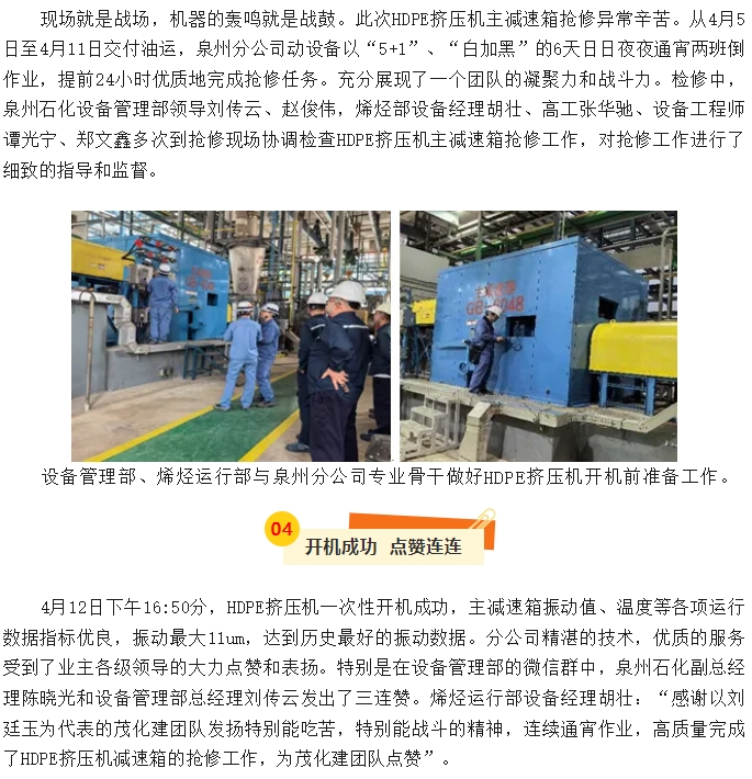 泉州分公司HDPE擠壓機主減速箱搶修紀實