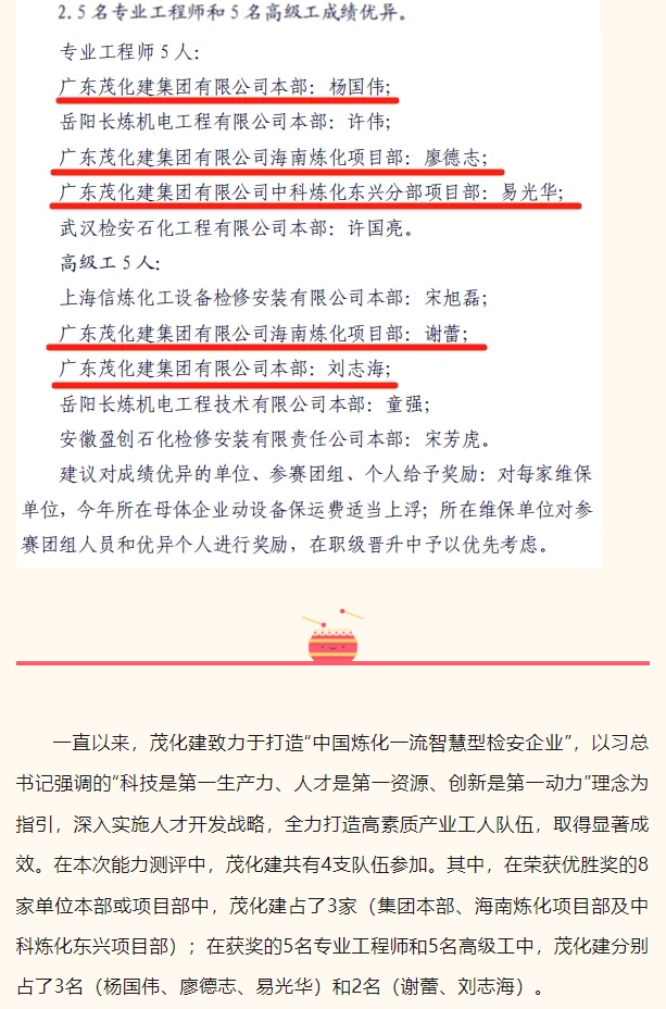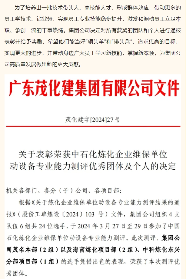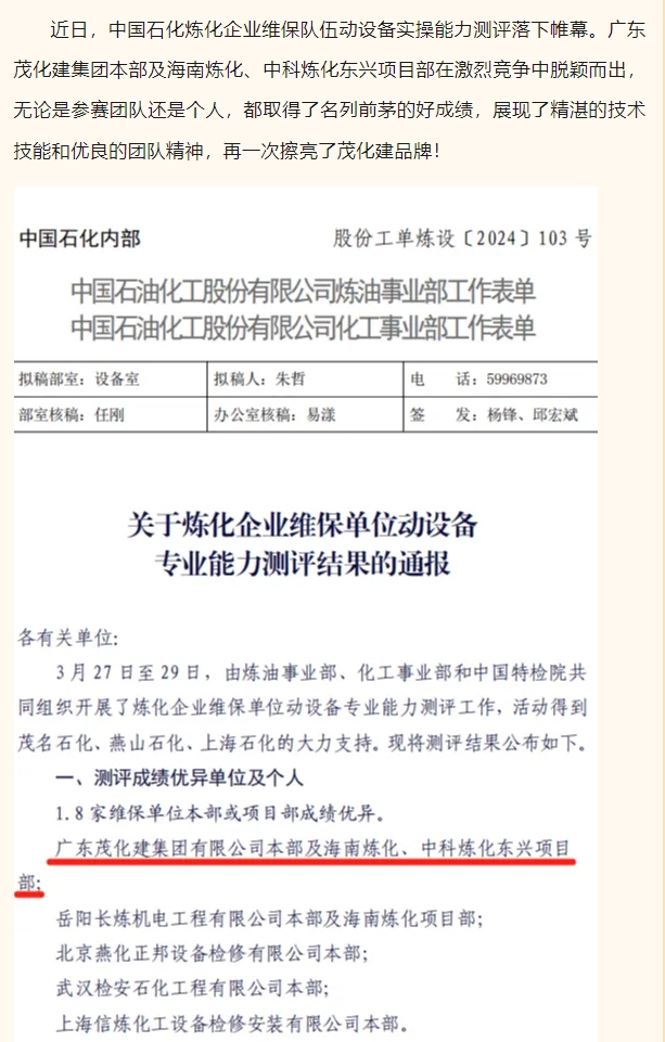 祝賀!茂化建在中石化煉化企業(yè)維保隊(duì)伍動設(shè)備實(shí)操能力測評中成績優(yōu)異,名列前茅