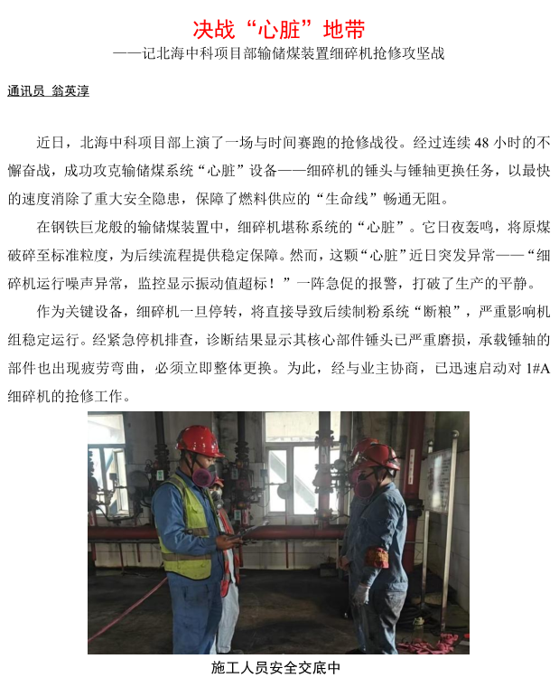 北海中科項(xiàng)目部輸儲煤裝置細(xì)碎機(jī)搶修攻堅(jiān)戰(zhàn)